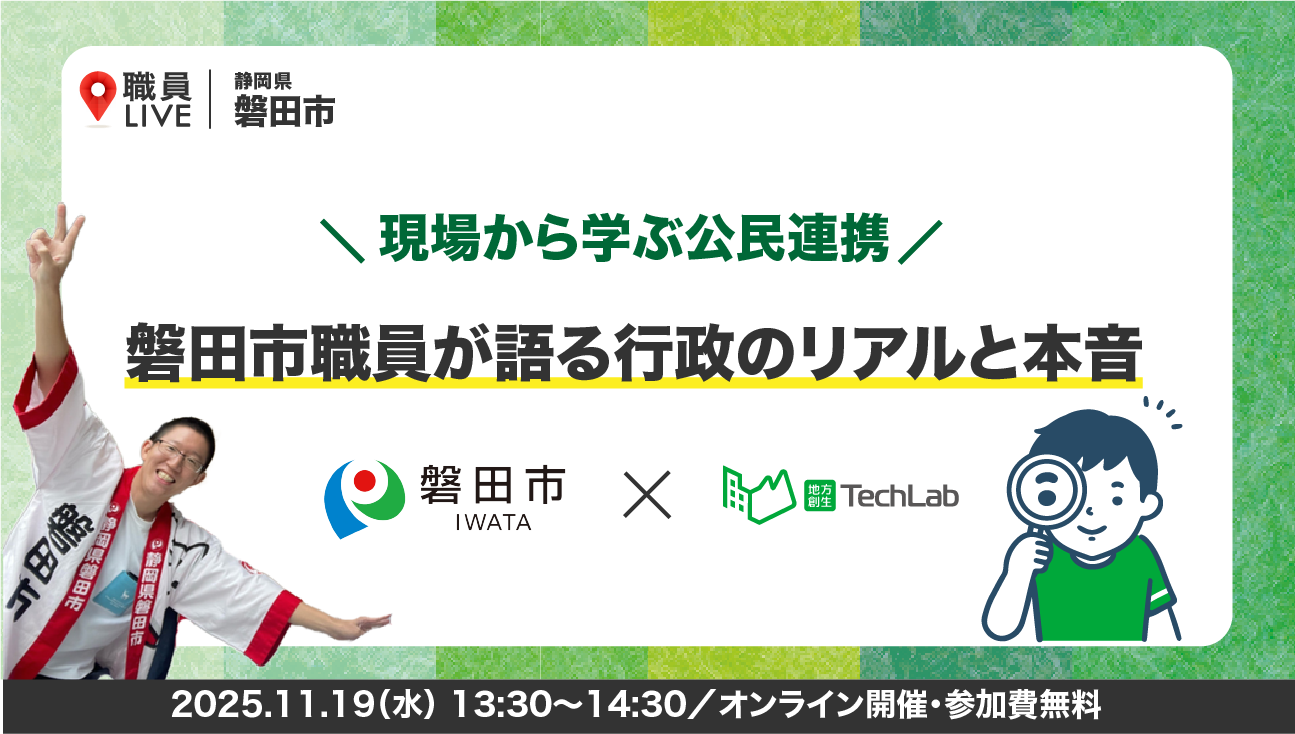 本セミナーでは、地方創生テクノロジーラボと連携協定を結ぶ磐田市より、 実際に公民連携を推進してきた職員・後藤氏をお招きし、 “成功と失敗の両面”からリアルな経験談を共有いただきます。